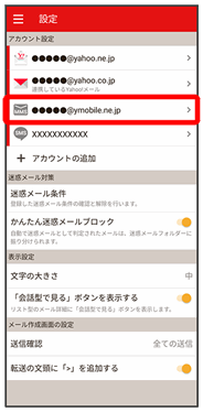 | アカウント設定 | メールアカウントの設定ができます。詳しくは、「Y!mobile メールの設定」「MMSの設定」「SMSの設定」を参照してください。 | |