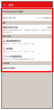 | 未登録 | 電話帳に未登録の相手からメールを受信したときの通知方法を設定します。 | |