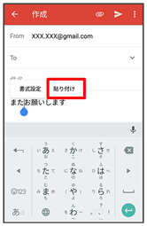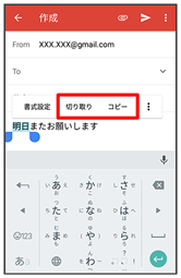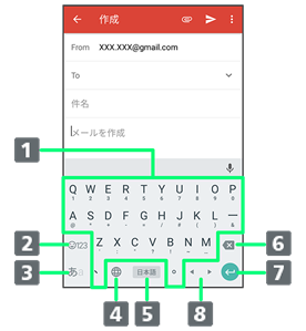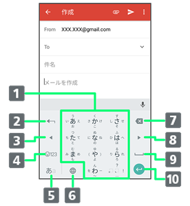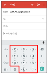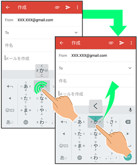 キーを上下左右にフリックすることで、キーを繰り返しタップすることなく、入力したい文字を入力できます。キーをロングタッチすると、キー入力ガイドが表示されます。入力したい文字が表示されている方向にフリックすると、文字が入力されます。