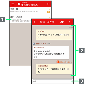 会話型表示では、宛先ごとに送受信したメールをまとめて表示します。たとえば、植田さんとやりとりしたメールを確認するときは、1つのスレッドの中で植田さんと会話をしているように表示されます。