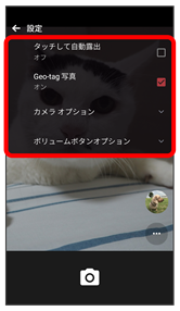 カメラの設定を変更します。設定できる項目は撮影モードにより異なります。