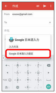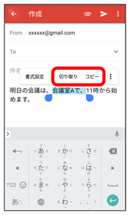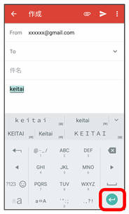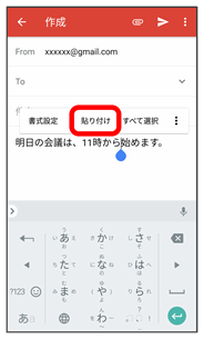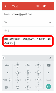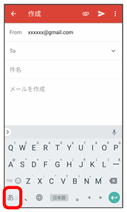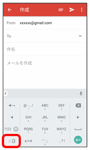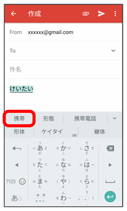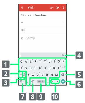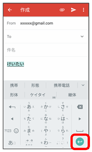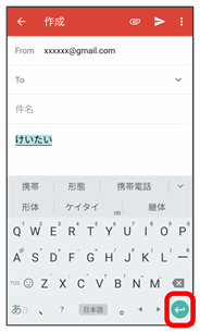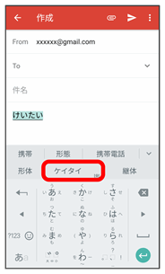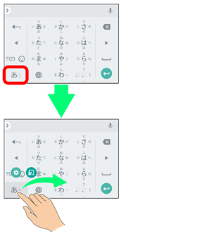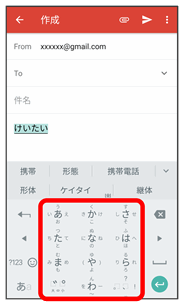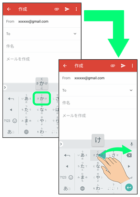 ケータイ配列で入力するとき、キーを上下左右にフリックすることで、キーを繰り返しタップすることなく、入力したい文字を入力できます。キーをロングタッチすると、キー入力ガイドが表示されます。入力したい文字が表示されている方向にフリックすると、文字が入力されます。