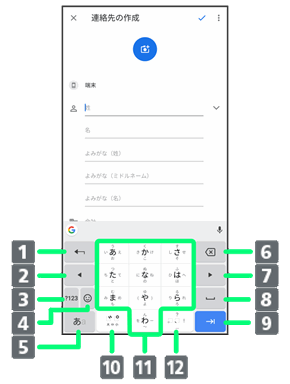 | 設定 | キーボードの表示内容や、キーボードのレイアウト、キーボード操作時の効果音/バイブなどを設定できます。 | |