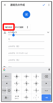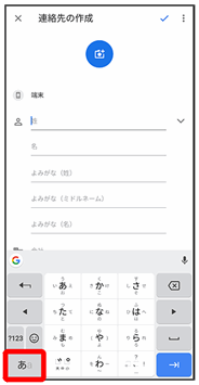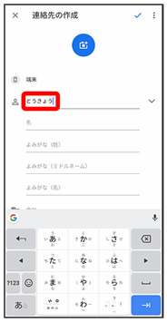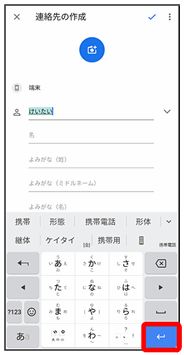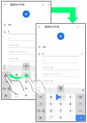キーを上下左右にフリックすることで、キーを繰り返しタップすることなく、入力したい文字を入力できます。キーに触れると、フリック入力で入力できる候補が表示されます。入力したい文字が表示されている方向にフリックすると、文字が入力されます。