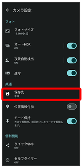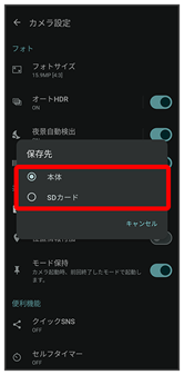 お買い上げ時、本機で撮った写真や動画は、内部ストレージに保存されるように設定されています。SDカードに保存する場合は、保存先の設定を変更してください。