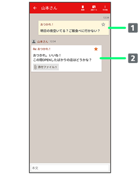 • 電話帳に未登録の宛先のメール送受信画面で、宛先グループ(相手)名をタップ