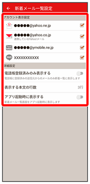 • ↓新着メール一覧設定画面でアプリ起動時に表示する