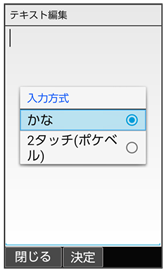 を押します。 - 入力方式には、「かな方式」と「2タッチ方式」の2種類があります。設定方法について詳しくは、「文字の入力方式を設定する」を参照してください。