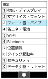 | マナーモード設定 | マナーモードを設定します。 詳しくは、「マナーモードを利用する」を参照してください。 |