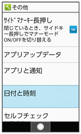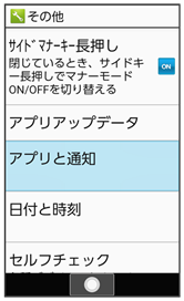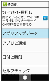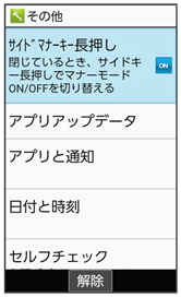| サイドマナーキー長押し | クローズポジション時に、サイドボタン長押しでマナーモードに切り替えるかどうかを設定します。 | |