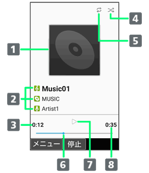 • 音楽再生画面でicn_button_mail(メニュー)→ヘルプと操作しても表示できます。