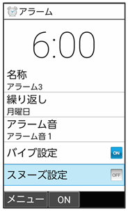 | スヌーズの間隔 | スヌーズ(くり返しアラームが鳴る機能)の間隔を設定します。 | |
