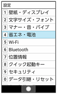 電池の消費を抑えたり、電池の利用状況を確認することができます。設定できる項目は次のとおりです。