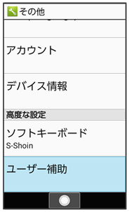 | ユーザー補助 | 本機を使用するうえで便利なユーザー補助に関する機能を設定できます。 |