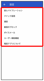 | ボイスメール | ・通知 ボイスメールの通知に関する設定をします。 ・詳細設定 ボイスメールの詳細設定を確認できます。 |
