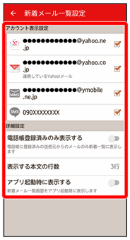 • ↓新着メール一覧設定画面でアプリ起動時に表示する