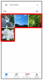 内部ストレージやSDカード、Googleのオンラインストレージに保存されている写真/動画を表示します。ここでは、Google アカウントにログインしている状態で説明します。