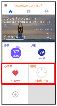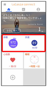 歩数・歩速や心拍数、睡眠時間などのデータを元に、「Lalasia」サイトと連携して健康管理を行うことができます。