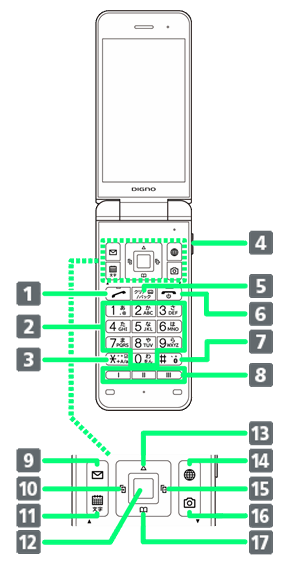 | 「♯」を入力、すぐ文字を起動1、Bluetooth®のON/OFF(長押し) | ||