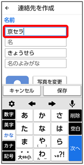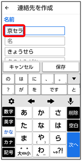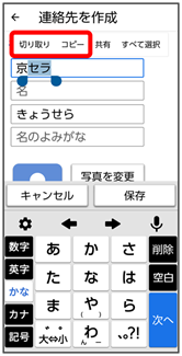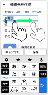 テンキーで入力するとき、キーを上下左右にフリックすることで、キーを繰り返しタップすることなく、入力したい文字を入力できます。キーに触れると、フリック入力で入力できる候補が表示されます。入力したい文字が表示されている方向にフリックすると、文字が入力されます。
