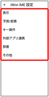 | その他 | ・学習辞書リセット 学習辞書をリセットできます。 ・設定リセット すべての設定を初期化します。 ・オープンソースライセンス オープンソースライセンスを確認できます。 ・iWnn IME iWnn IMEのバージョンを確認できます。 |