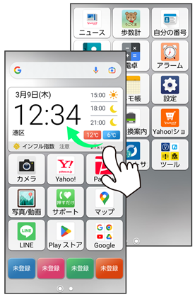 ホーム画面を左右にフリックすると、ホーム画面シートを切り替えることができます。