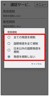 - 発着信規制中に電話やSMSを発信しようとすると、発信できない旨のメッセージが表示されます。お客様がご利用になる地域によっては、表示されるまでに時間がかかることがあります。