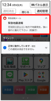 メッセージが表示され、緊急地震速報/災害・避難情報個別の警告音およびバイブレータでお知らせします。