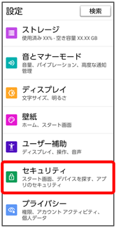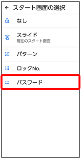 - スタート画面のセキュリティ解除方法の設定について詳しくは、「パターンを指でなぞってスタート画面のセキュリティを解除するように設定する」、「ロックNo.でスタート画面のセキュリティを解除するように設定する」、「パスワードでスタート画面のセキュリティを解除するように設定する」を参照してください。