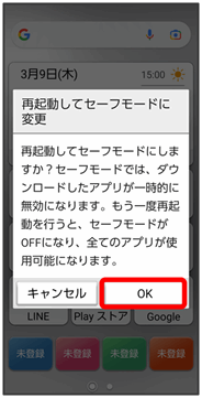 • セーフモードで電源を入れると、画面左下に「セーフモード」と表示されます。