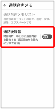 通話後録音が有効の場合は、通話後に録音するかどうかのメッセージが毎回表示されます。録音するをタップすると通話音声メモが保存されます。