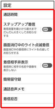 通話に関する設定ができます。設定できる項目は次のとおりです。