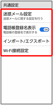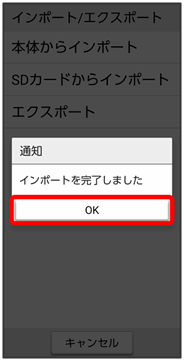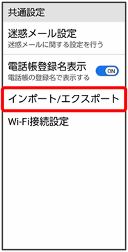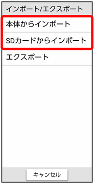 インポート/エクスポート メールデータを本体メモリやSDカードからインポート、エクスポートします。