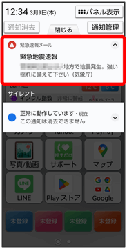 メッセージが表示され、緊急地震速報/災害・避難情報個別の警告音およびバイブレータでお知らせします。