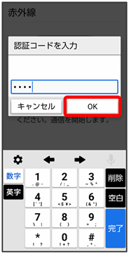 認証コードは、正しい通信相手かどうかをお互いに確認するための暗証番号です。送信側/受信側で同じ数字(4桁)を入力します。特に決まった数字ではなく、その通信限りのものです。