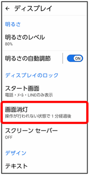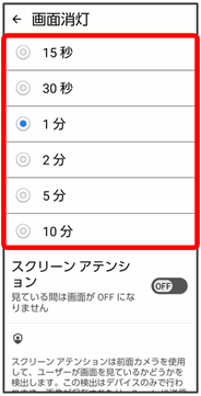| 画面消灯 | 一定時間操作をしなかったときに、画面が自動消灯するまでの時間を設定します。 | |