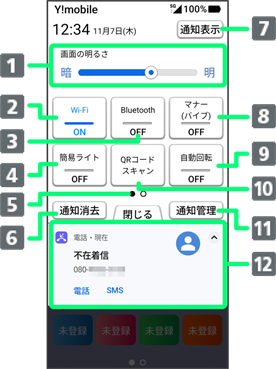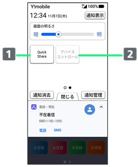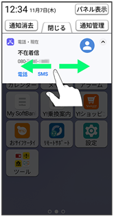 - 通知によっては機能を利用できます。たとえば着信の通知では、着信のあった電話番号に発信したり、SMSを送信できます。