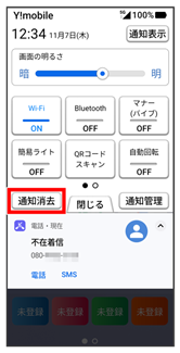 ステータスバーを下にフリック/スワイプすると、通知パネルを開くことができます。通知パネルでは、通知アイコンとその内容を確認できます。