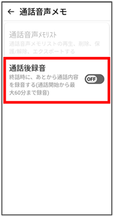 通話後録音が有効の場合は、通話後に録音するかどうかのメッセージが毎回表示されます。録音するをタップすると通話音声メモが保存されます。