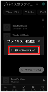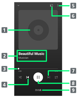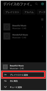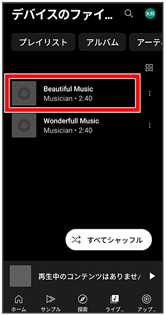 公式アルバムやミュージックビデオなど幅広い音楽コンテンツが楽しめます。ここでは内部ストレージ/SDカードに保存されている音楽を再生する操作を例に説明します。
