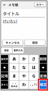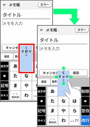 キーを上下左右にフリックすることで、キーを繰り返しタップすることなく、入力したい文字を入力できます。キーに触れると、フリック入力で入力できる候補が表示されます。入力したい文字が表示されている方向にフリックすると、文字が入力されます。