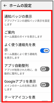 | よく使う連絡先を表示 | ホーム画面によく使う連絡先を表示するかどうかを設定します。 | |