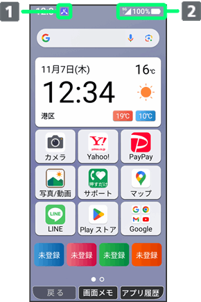 ステータスバーは、本機の画面上部にあります。新着メールなどの通知アイコンや、本機の状態をお知らせするステータスアイコンが表示されます。