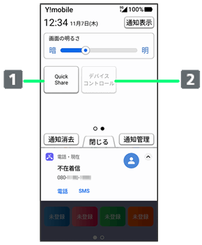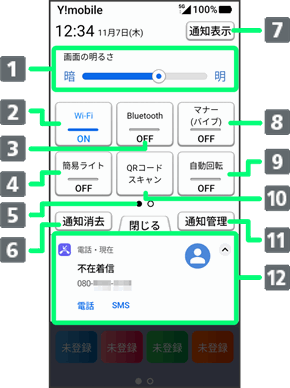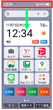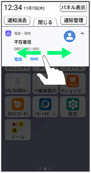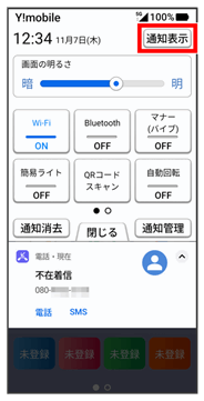 ステータスバーを下にフリック/スワイプすると、通知パネルを開くことができます。通知パネルでは、通知アイコンとその内容を確認できます。