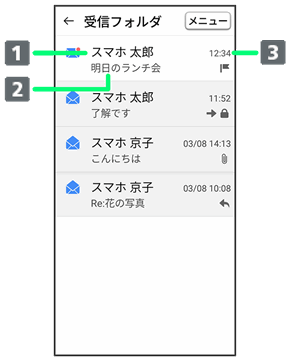 • 未読メールフラグ添付ありをタップすると、選択した条件でメールの表示が絞り込まれます。