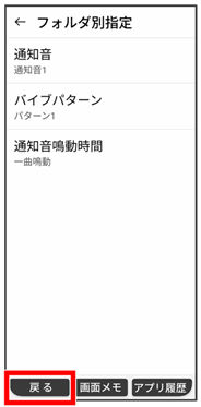 • ↓フォルダ別指定画面で通知音鳴動時間