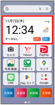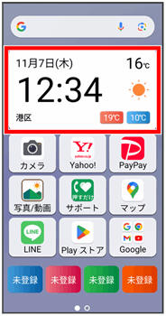 ホーム画面の「時刻/天気」部分には、現在地の天気情報が表示されます。