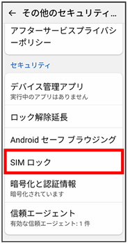 | その他のセキュリティとプライバシー | ・ロック画面上の通知 ロック画面での通知表示を設定できます。 ・ロック画面にメディアを表示 ロック画面にメディアプレーヤーを開いたままにできます。 ・アプリのコンテンツ Android システムにコンテンツを送信することでアプリの許可をするかどうかを設定します。 ・Android System Intelligence 交流したユーザー、操作したアプリやコンテンツに基づいて候補を表示するかどうかなどを設定します。 ・Google の自動入力サービス Google アカウントに保存されているパスワード、住所、クレジットカードなど自動入力する情報を管理します。 ・使用状況と診断情報 使用状況と診断情報をGoogleに自動的に送信するかどうかを設定します。 ・アフターサービスプライバシーポリシー アフターサービスプライバシーポリシーを確認できます。 ・デバイス管理アプリ デバイス管理アプリの有効/無効の設定をします。 ・ロック解除延長 画面ロックの解除方法をパターン/ロックNo./パスワードに設定しているとき、本機を持ち運んでいるかどうかや、信頼済みの場所/端末を確認して、自動的に画面ロックを解除するかどうかを設定します。 ・Android セーフ ブラウジング 有害なリンクやウェブページといったセキュリティ上の脅威について警告します。 ・SIM ロック SIMロックに関する設定を行います。 ・暗号化と認証情報 本機の暗号化や、認証情報について確認・設定します。 ・信頼エージェント 信頼エージェントを有効にするかどうかを設定します。 |