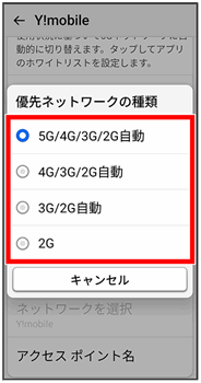 • お買い上げ時は5G/4G/3G/2G自動に設定されています。日本国内や3Gネットワークの通信事業者のみの地域で本機を使用する場合は設定を変更する必要はありません。