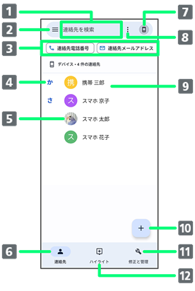 | 電話番号やメールアドレスなど、登録されている情報の種類でフィルターをかけて連絡先を表示します。 | ||